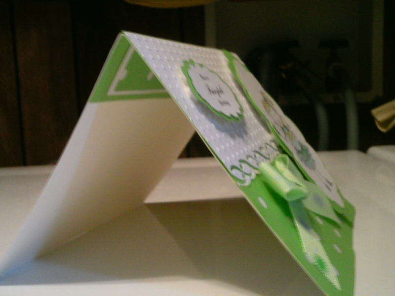 I inked the embossing and all edges, added some pop dots and some rhinestones from The Paper Studio. The ribbon is from Wal-Mart and the patterned paper is from K & Company. The paper is 12x12, but I cut a 4x12 strip, trimmed 1" from the length to make a 4x11 piece that I could fold in half and end up with a 4x5 1/2 card. Then used the 1" piece to complete the inside. This way I can get 3 cards from one sheet of paper! Am I thrifty or what?? ;-)
