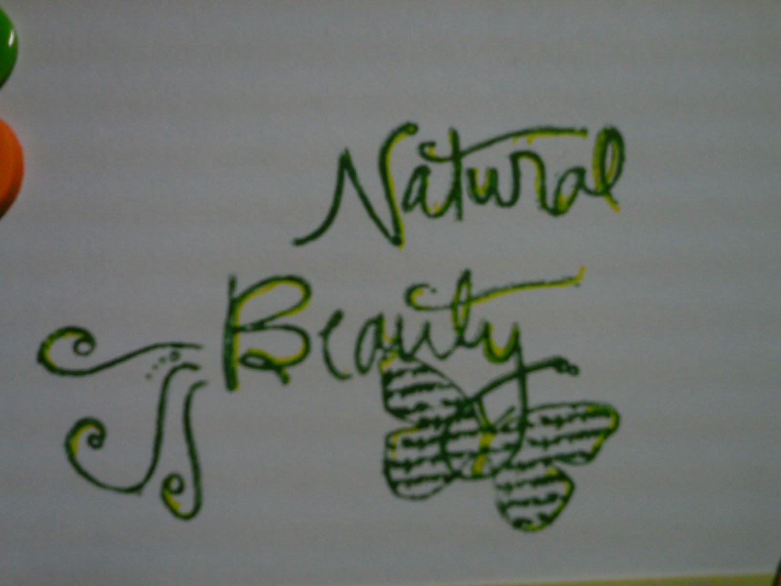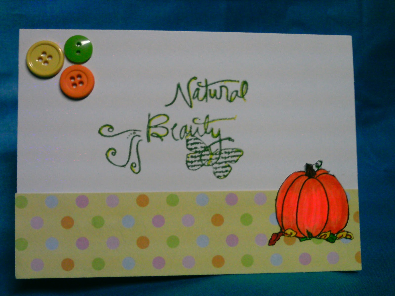I used a basic white card base and added a strip of polka dot paper from Paper Studio. The pumpkin is a digi stamp from Designed 2 Delight, colored with my Dual Tip brush pens from Hobby Lobby. The sentiment stamp is from Autumn Leave Clear Stamps and is part of the goodies I won from Circle B. I inked the stamp with green marker and then used a yellow marker to add a little highlighting to it. The stamp actually says "All Natural Beauty", but I wanted to follow a card recipe that required a 2 word sentiment and I like the generality of the sentiment this way.