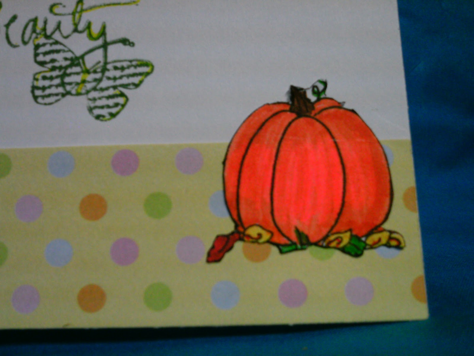 Now here's the thing.....I don't know where this pumpkin stamp came from or how it came to be on my scrap paper! I don't have this stamp and I looked through the stamps we have at work in our scrapbook supplies and I don't find it. If anyone recognizes this stamp, PLEASE tell me where it comes from. I think I would like to get it. I'm wondering if this piece of scrap was actually in with some paper I bought at a yard sale maybe.
