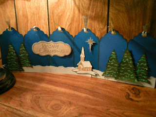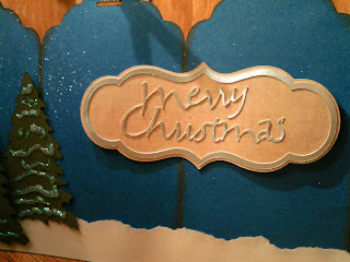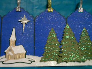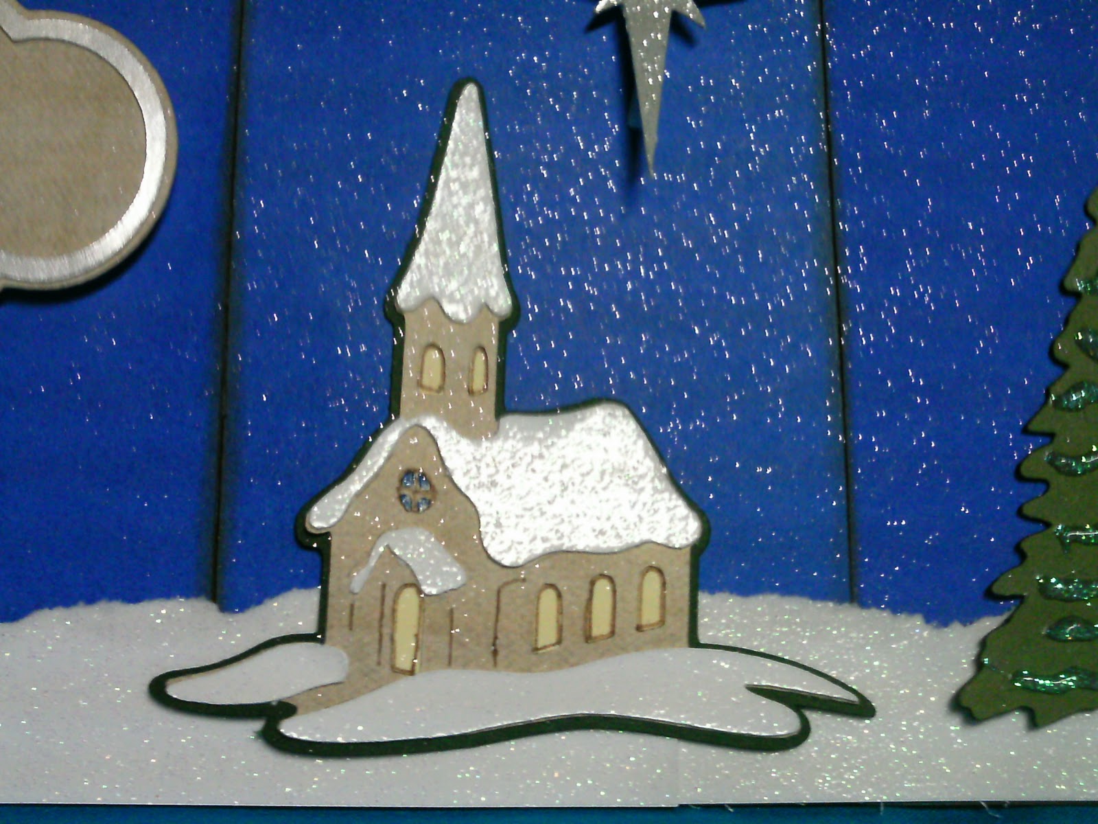 The trees and the church are from Christmas seasonal cartridge and the star is from Joys of the season. I used white glitter glue on the trees. Really, it's white, not green like it looks in the picture! ;)