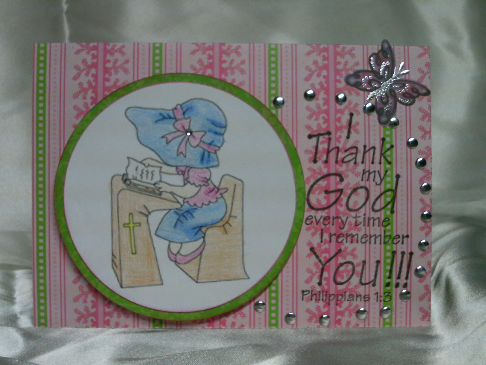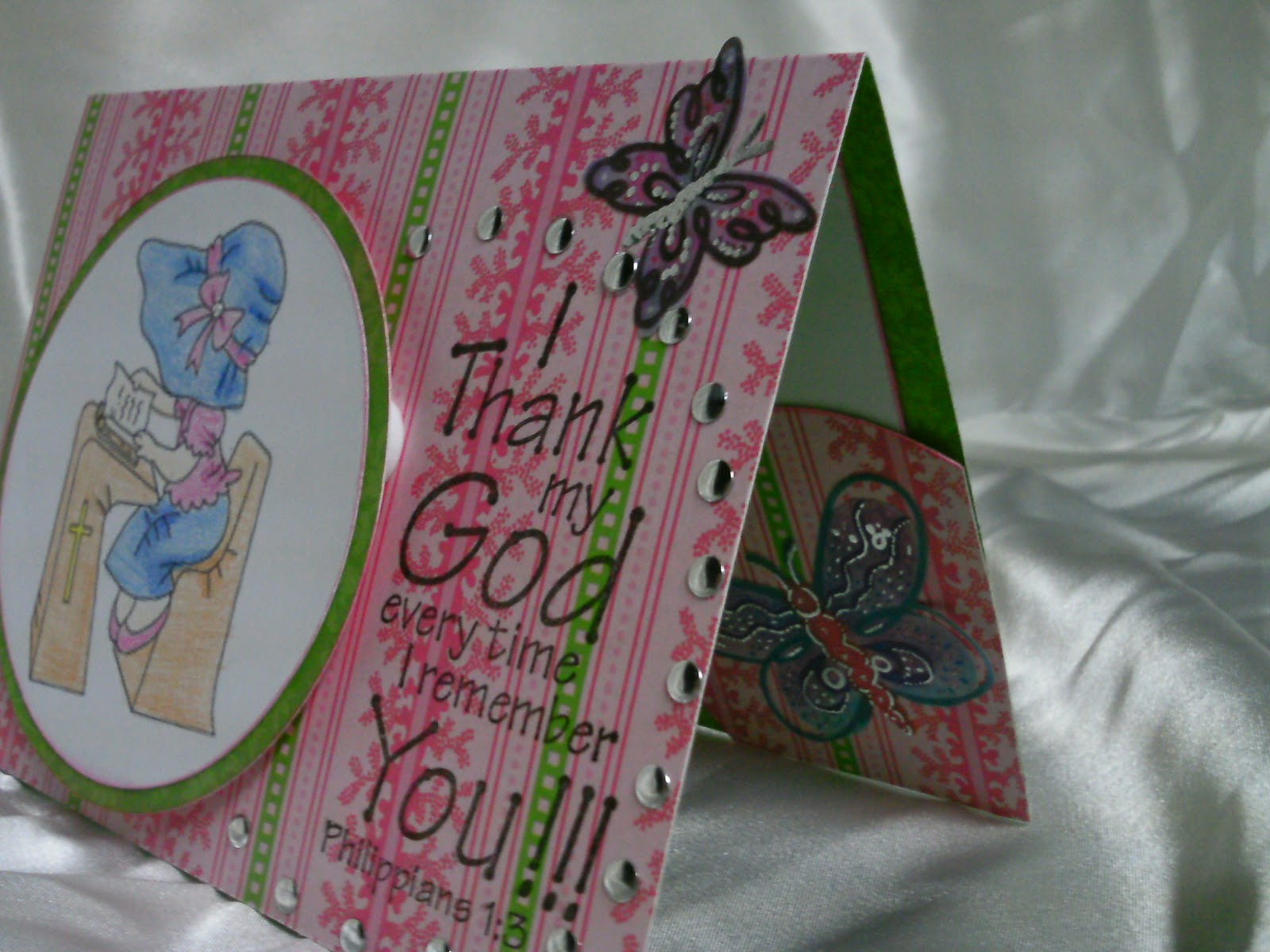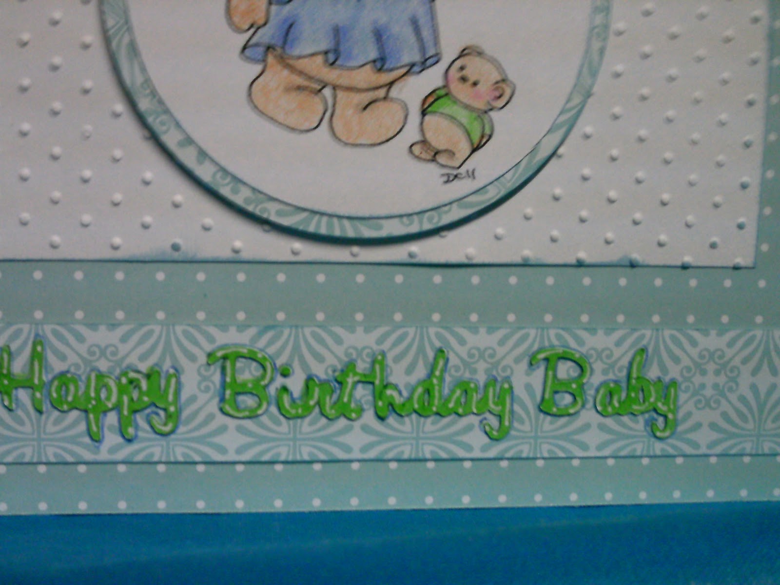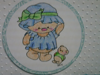 The ribbon on the inside is baby blue swiss dot from Wal-Mart and the image is pop dotted with a very thin pop dot. All edges are inked with Stampabilites Baby Blue.