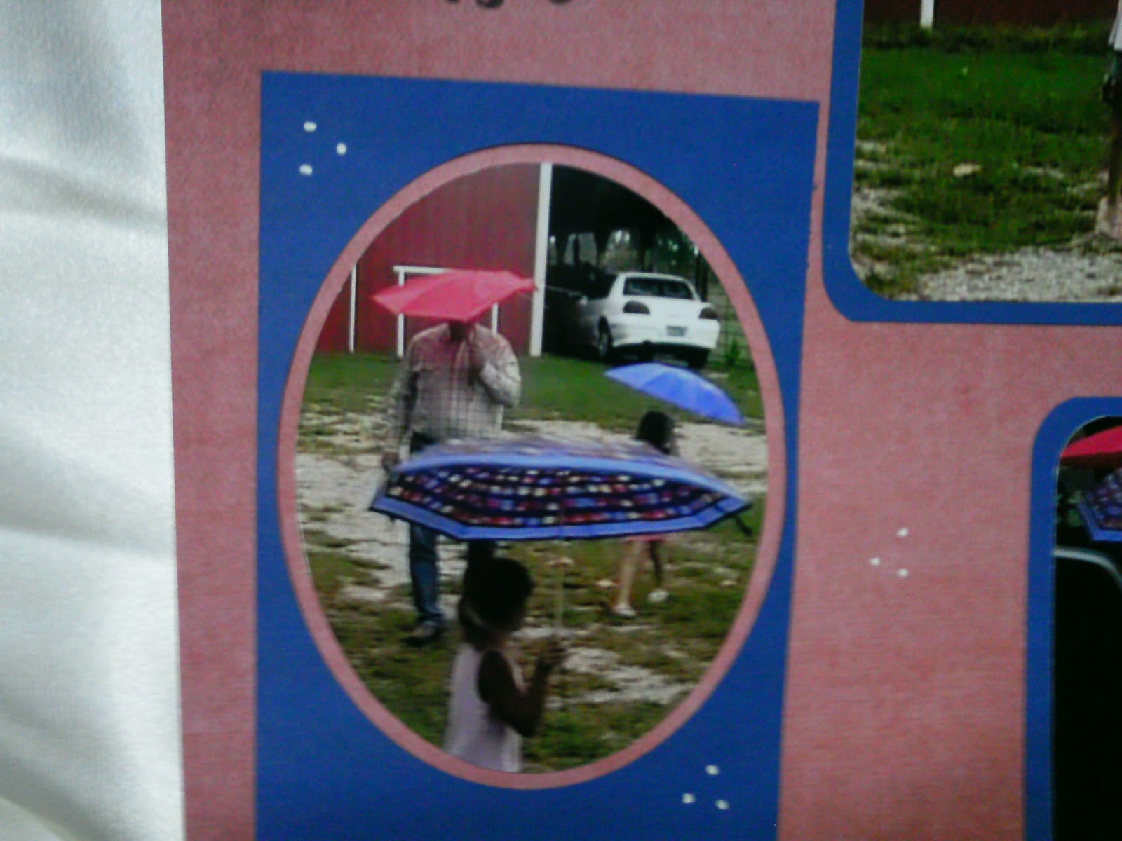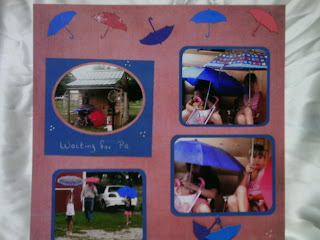 I would like to share with you a layout I made of my girls and my hubby. One rainy afternoon the girls wanted to help their Pa get into the house dry, so they waited for him with umbrellas in hand. I suspect they really wanted to play with the umbrellas more than they were concerned about their Pa getting wet! :)