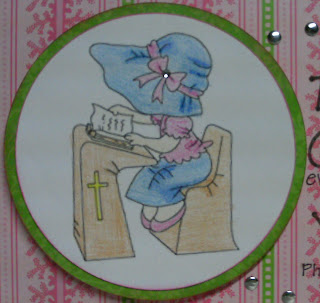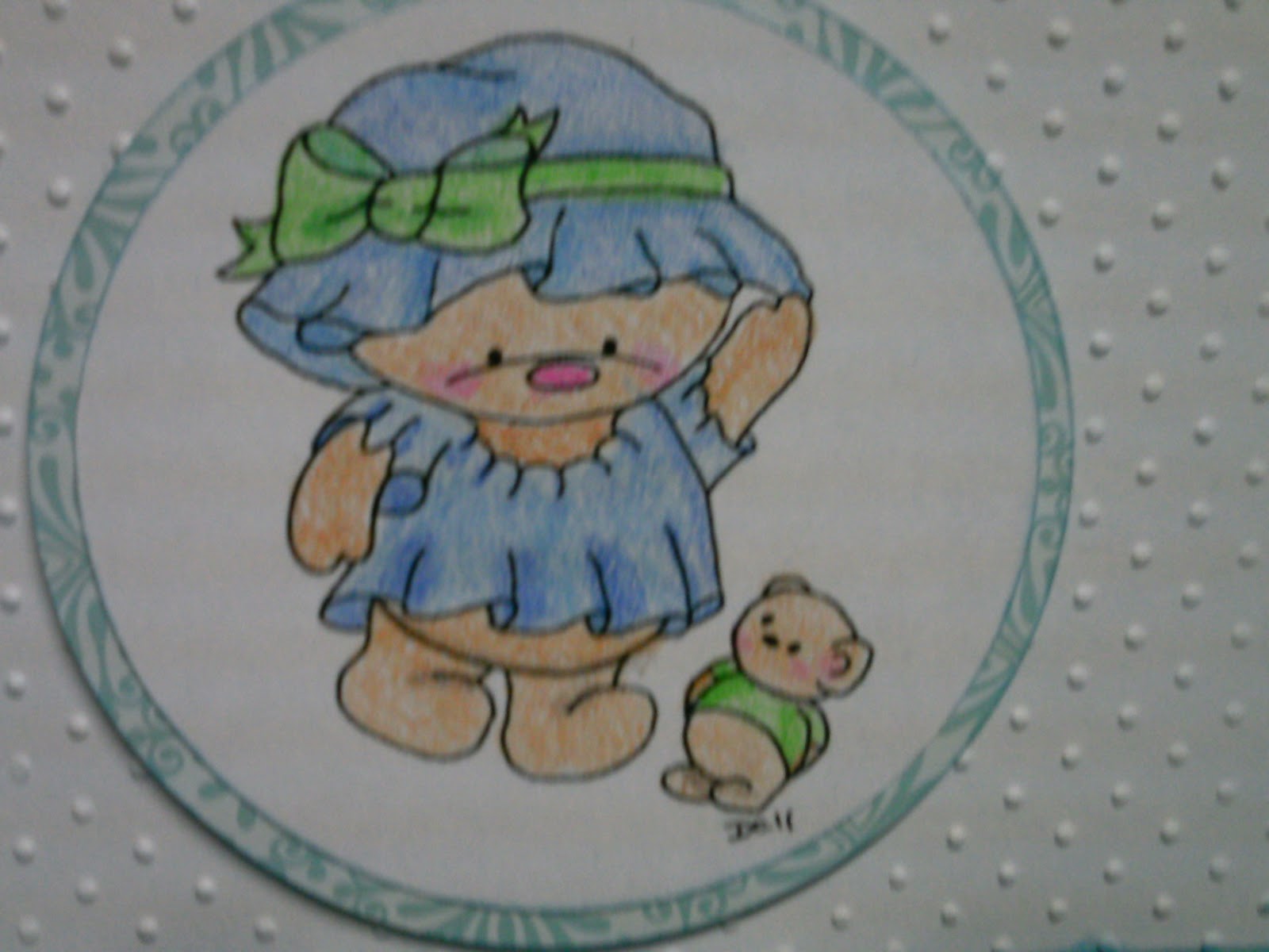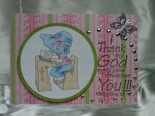 The digi stamp is a free one I found several months ago that I can not locate now to give proper credit for. I colored it with Crayola colored pencils. The circles are cut with Creative Memories circle cutting system.The sentiment is cut from Paper Lace at 1/2" and welded on my Gypsy. I kind of blended in, so I outlined it with a dark green marker, then added some accents with a white gel pen.