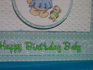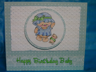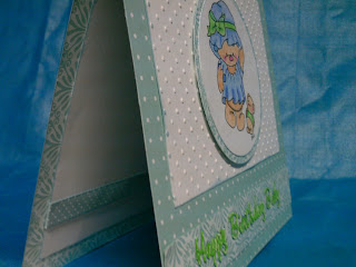 I really like the way this turned out. The patterned paper is from Martha Stewart's Baby Boy pack. The white mat has been embossed with the Cuttlebug Swiss Dots folder.