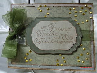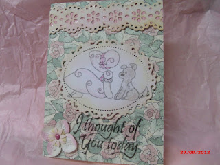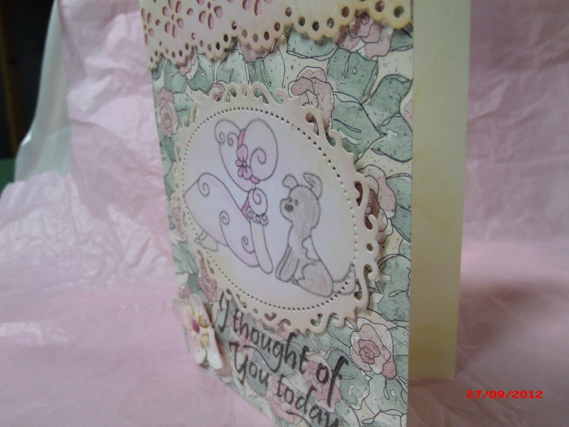 This lable is an Imagine cut. The second layer is silver foil paper. I added a few gems to the flowers on the embossing. The sentiment stamp is from Pink by Design.