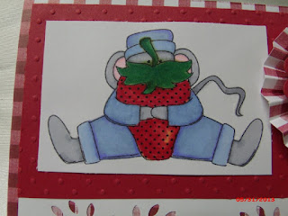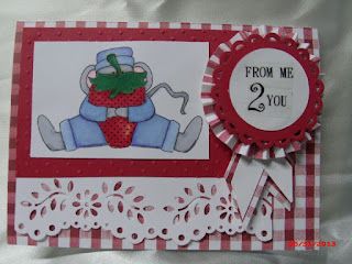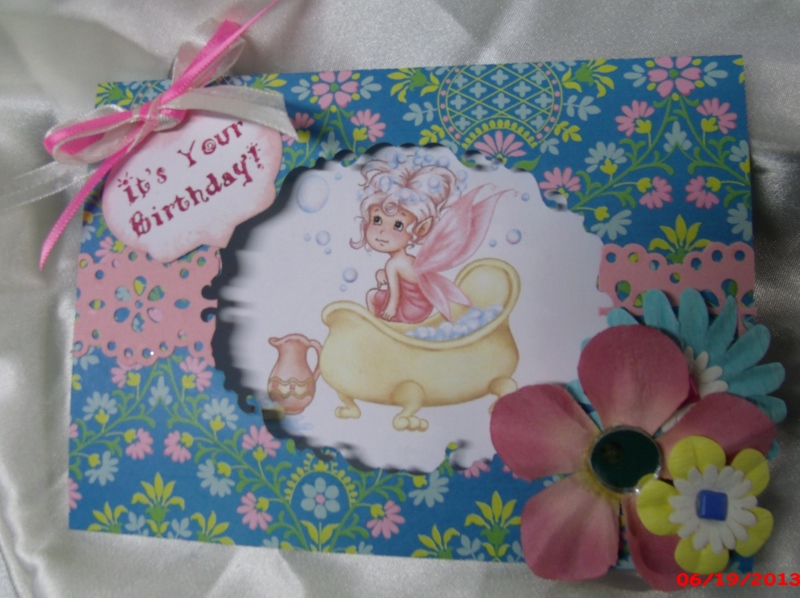 I cut the image out with the largest of Fancy Ovals from Spellbinders, then cut the window in the card with a smaller size. A tag from Spellbinders, stamp from Pink By Design, lace border punch from Martha Stewart and flowers from The Paper Shelter. On the large pink flower I added a small mirror circle from my stash and brads to the other flowers.