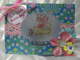I cut the image out with the largest of Fancy Ovals from Spellbinders, then cut the window in the card with a smaller size.  A tag from Spellbinders, stamp from Pink By Design, lace border punch from Martha Stewart and flowers from The Paper Shelter.  On the large pink flower I added a small mirror circle from my stash and brads to the other flowers.