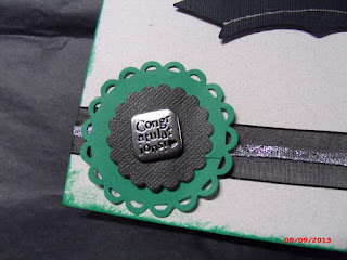 I added a little border strip with a Martha Stewart border punch.  When I decided to add this strip, I just grabbed a sheet of white paper laying on my worktable that I thought "felt" really nice.  I turned it over and it was the cover sheet from a package of white cardstock!  It cut really well so I also used it for the sentiment circle! So I did a little bit of recycling, too!  :)  The medallion has a Spellbinders scalloped circle and the sentiment is a freebie from Scrapalicious.