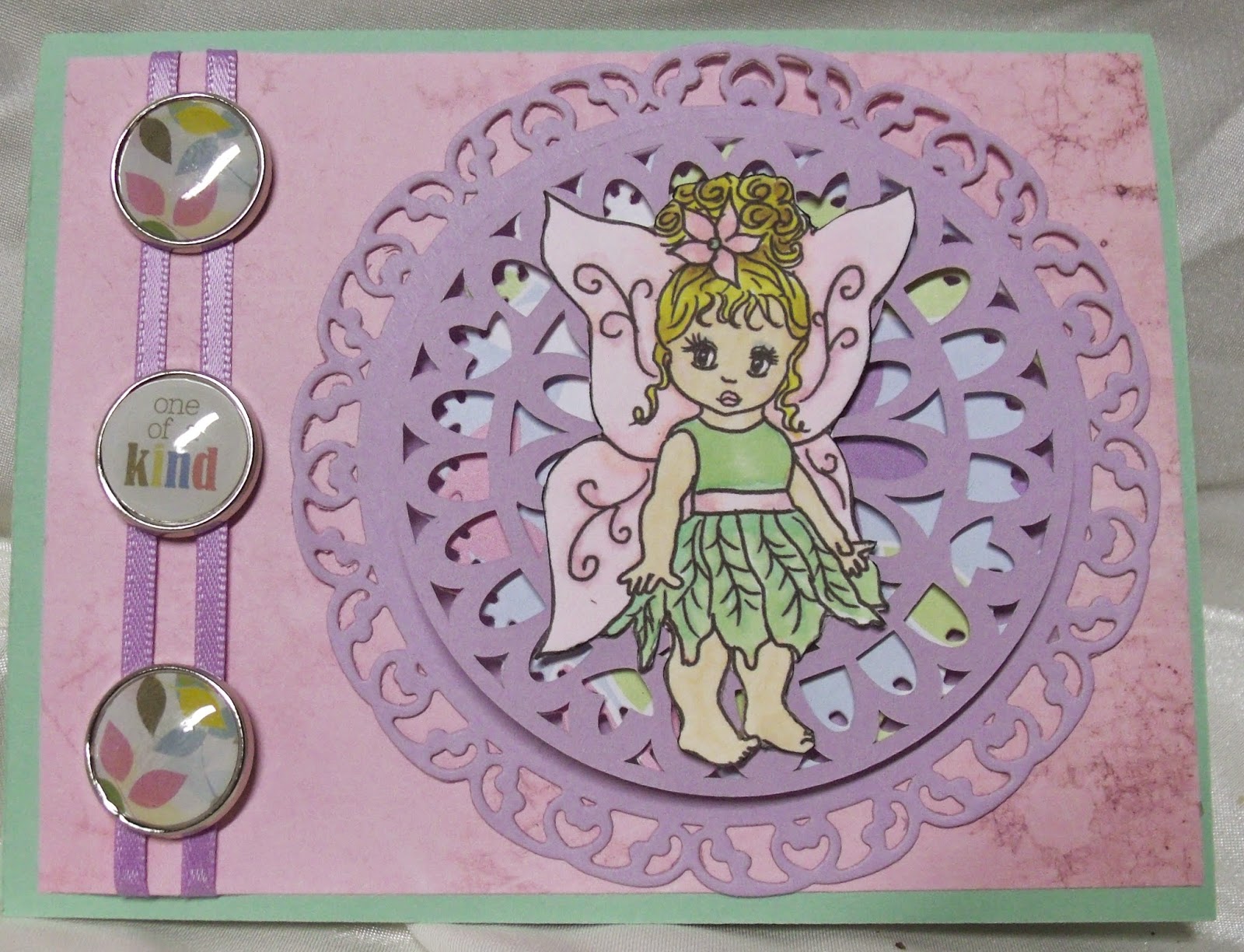This sweet little fairy is from Whoopsie Daisy and colored with Spectrum Noir. Two of the doilies are Spellbinder dies and the top one is from Cricut's Paper Lace cartridge. The 3 Epoxy brads are from Studio G.