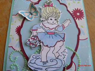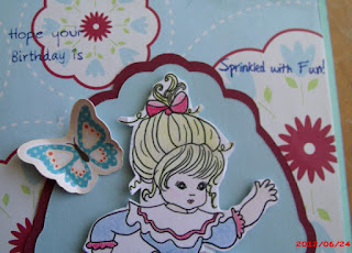 This cute little girl is from Whoopsi Daisy. I colored her with Crayola twist up pencils and pop dotted her onto a cut from Lacy Labels. I resized them on my Gypsy. I love being able to do that! The little butterfly is cut from Imagine More. The patterned paper doesn't have a name on the back, so I don't know the company. I think I bought it at Michael's? The sentiment is from Pink By Design's "Take The Cake" set. I used 3 different stamps on that set to make it.