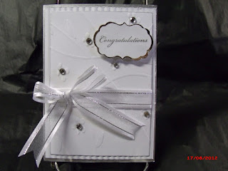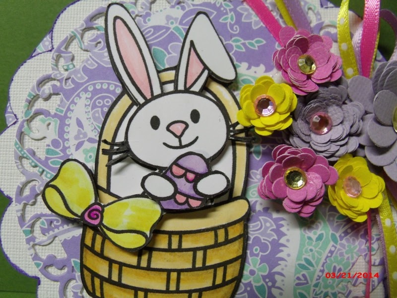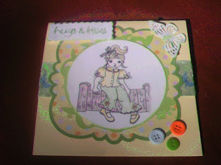 All papers and the lacy medallion are printed and cut with the Imagine cartridge "Lori's Garden". The medallion is mounted on a Just Rite lacy circle stamp, which is then on a Spellbinders Lacy Circle cut. I added a few gems and strip of ribbon. Inside I used a sympathy stamp from My Sentiments Exactly.
