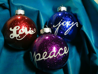 These are the ornaments up close. They are made by coating the inside with liquid floor wax then adding glitter. You can find a good instructional video here. Then add words cut from white vinyl. I've made lots of these as they are really easy, super shiney and the glitter all stays inside! I recently saw a video using spray adhesive inside instead of the liquid floor wax. I'm going to give that a try,too.