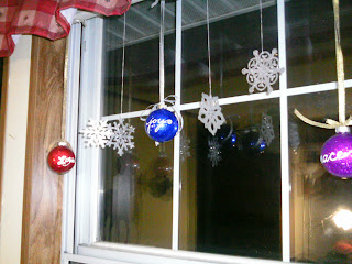 So here are some nighttime pics. The snowflakes are cut from those plastic sheets for overhead projectors. Remember those? From the days before PowerPoint? Well I have a whole box of them to use up! The cuts are from Joys of the season and Christmas seasonal cartridge. (It works best to use a multi cut of 2). Then I sprayed them with Photo Mount and added glitter, doing this on both sides. After they dry completely, I tied them up with sewing thread, which doesn't show up during the day.They are really pretty and sparkly! Try to picture these picking up some sunshine. :)
